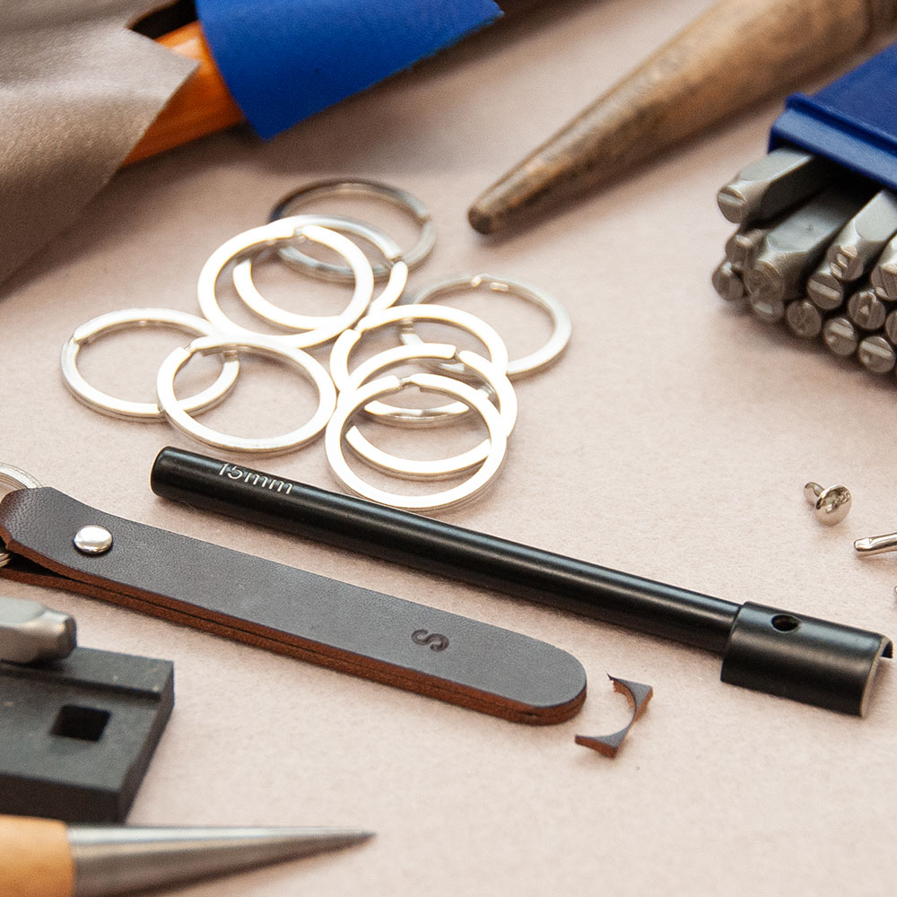 Ablauf: Nach einer kleinen Einführung zu den Besonderheiten von pflanzlich gegerbtem Leder wählst du aus drei Bandfarben (Schwarz, Mahagoni oder Cognac) deinen Favoriten aus. Die Bänder sind bereits zugeschnitten (1,5 cm breit, ca. 20 cm lang, SHAROKINA-Logo auf der Rückseite). Dann legst du die Details fest (gerade, schräge oder abgerundete Kanten, offene Enden oder Schlaufe, usw.) und führst alle Schritte unter Anleitung selbst durch. Wenn du möchtest, kannst du noch ein oder zwei Buchstaben oder ein Herz-Symbol einprägen. Dann vernieten wir alles und polieren die Kanten für ein professionelles Finish.